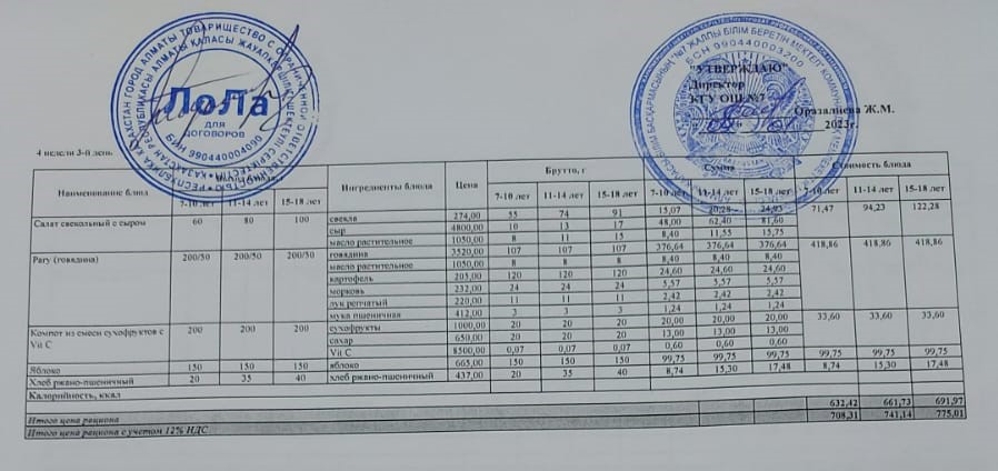 Бюджет қаражаты есебінен орта білім беру ұйымдарында білім алушыларды тегін тамақтандыруды ұйымдастыру үшін төрт апталық ас мәзірі/Четырехнедельное меню блюд для организации бесплатного питания обучающихся в организациях среднего образования за счет бюджетных средств